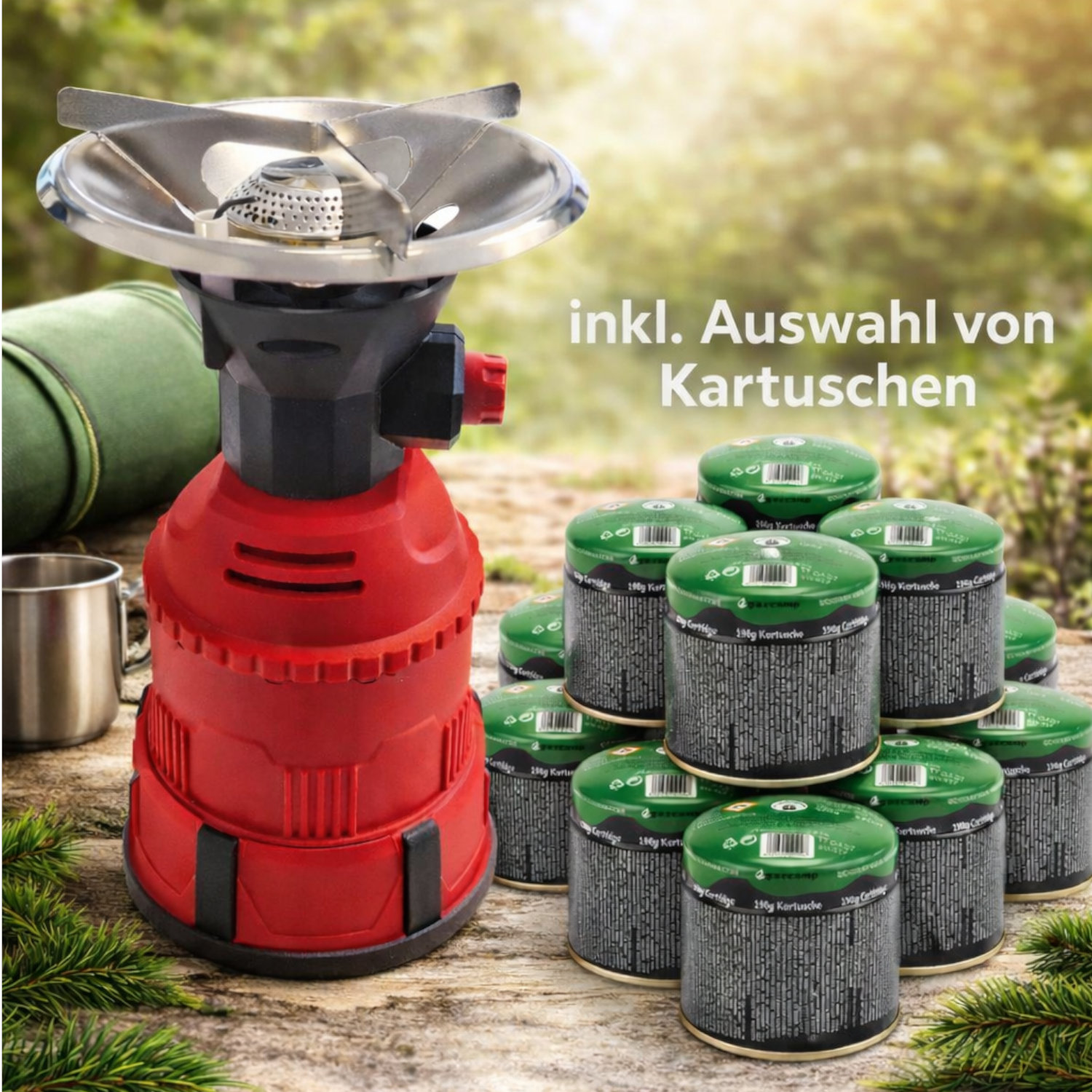 Kartusche: Kompatibel mit 190g Butangaskartuschen (EN 417 Stechkartusche mit ILL System), leicht erhältlich.